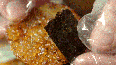7、瀝油,趁熱包上剪好的海苔片,海苔仙貝完成!