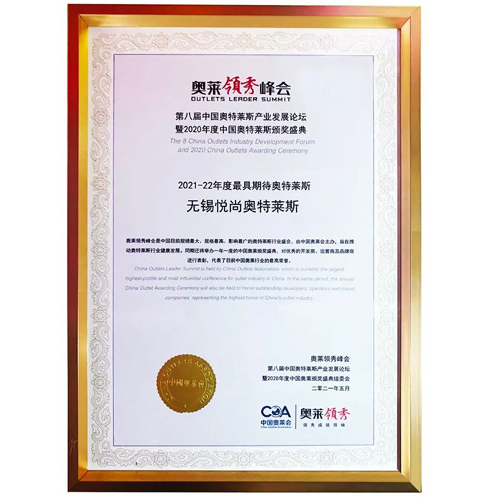 熱烈慶祝中閩百匯無錫悅尚奧萊 榮獲“2021-22”年度最具期待奧特萊斯
