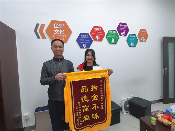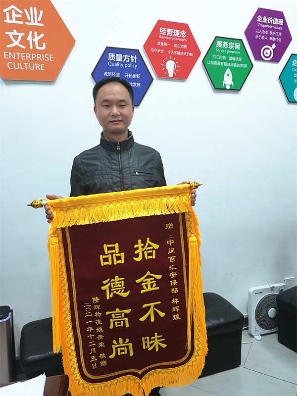 表揚(yáng)信 在2021年 12 月 4 日17:35左右,有一名顧客說在美嶺金街的上一個(gè)路口撿到一串汽車鑰匙,交給安保隊(duì)員王清煌,安保隊(duì)員王清煌說先放在通道桌子上。因當(dāng)時(shí)正值交換班吃飯沒有人員兼顧員工通道處,公司安保隊(duì)員林輝煌在員工通道值班想說待有人員接替時(shí)再予以拿到二樓客戶服務(wù)中心交上去。沒過一會(huì)兒,車主在金街尋找車鑰匙,在經(jīng)過員工通道的時(shí)候就停下來問我有沒有顧客撿到汽車鑰匙,安保隊(duì)員林輝煌就指引他在員工通道桌子上查看那串鑰匙,是否是自己丟失的汽車鑰匙,與他多方確認(rèn)后是他本人的汽車鑰匙,就及時(shí)將車鑰匙還給車主。車主系隆輝物流姚貴榮于2021年12月7日到門店送了一面“拾金不昧·品德高尚”的錦旗給到安保隊(duì)員林輝煌。